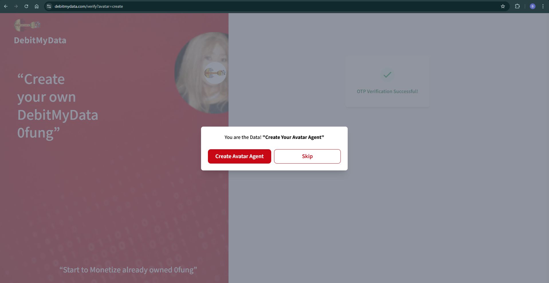 Once your wallet setup is complete, a Create Avatar Agent popup will appear. This is the first step in setting up your personalized digital identity.