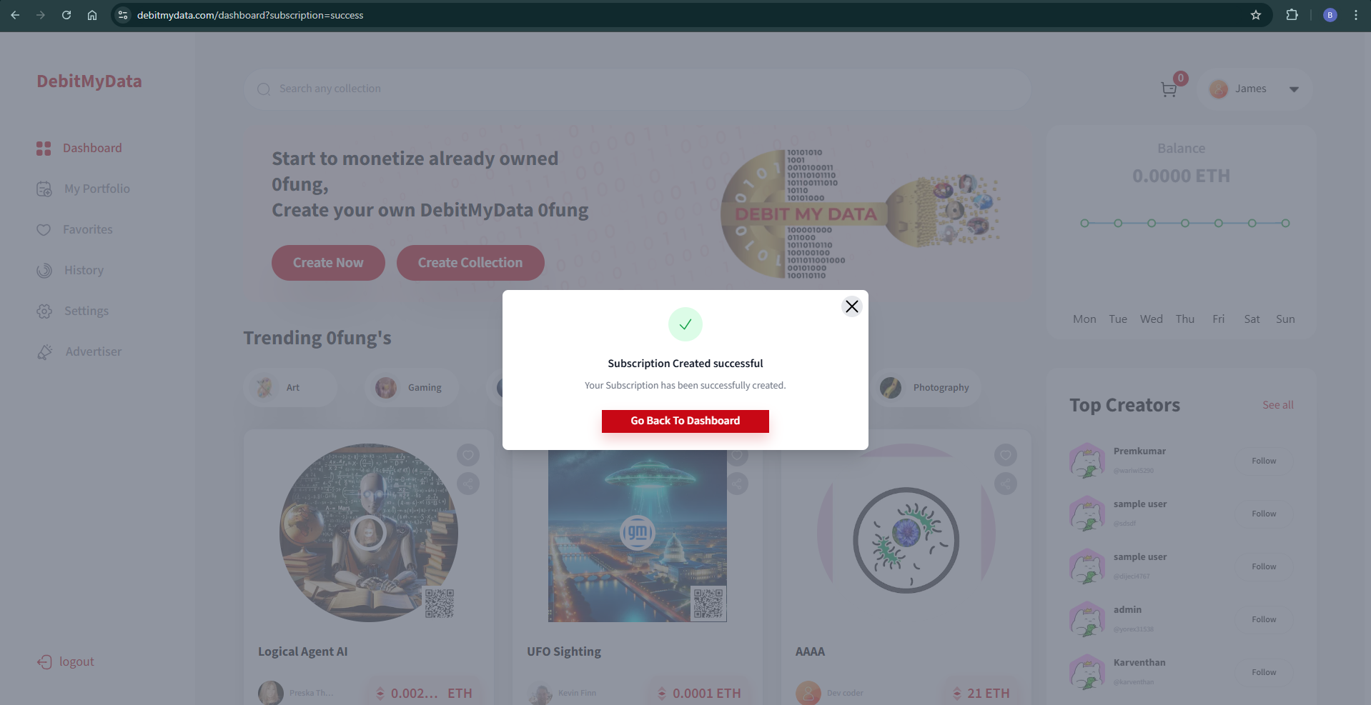 After the payment is processed successfully, you will be redirected to your dashboard. A Subscription Created Successfully popup will confirm that your account is now fully set up. Click on Go Back To Dashboard button to explore the dashboard page.